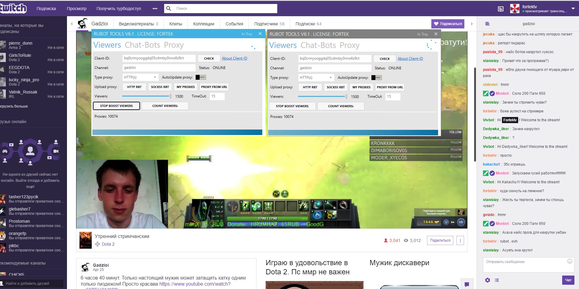 Adler Posted May 14, 2017 Posted May 14, 2017 Всем привет! Решил написать небольшую инструкцию по запуску софта. Софт работает на WPF .NetFrameWork 4.5. Минимальные требование к системе: Windows 8.1 (Windows Server 2012). 1. Перед тем как пользоваться программой, желательно обновить свой windows. (Как это делать, думаю, объяснять не стоит) 2. Обязательно устанавливаем необходимые компоненты (нужны для корректной работоспособности софта) https://rubot.ovh/soft/VisualC.exe https://rubot.ovh/soft/framework462.exe 3. Покупаем софт и скачиваем его с личного кабинета (C покупкой проблемы возникнуть не должны. Если по какой-то причине не можете пройти автоматическую оплату, отпишитесь в личные сообщения к Fortek) 4. Запускаем софт и проходим активацию (смотрим внимательно скриншоты) 5. После активации переходим во вкладу "Twitch" и создаём Client-IDИнструкция по созданию Client-ID (После создания вставляем его в программу и проверяем на валид) 6. Великие дела сделаны. Теперь осталось купить прокси и запустить накрутку (На нашем на сайте можно купить 2 вида прокси, сервисные и партнёрские. Первые очень не стабильные и выдают рандомное количество зрителей. За 5500р. партнёрские прокси работают стабильно и можно накручивать до 3000 вьюверов) Купить партнёрские прокси Купить сервис прокси Список сторонних продавцов 7. Сервисные прокси можно загрузить с помощью кнопок в программе (Если загрузили HTTP RBT, то ставим протокол HTTP(s) ) 8. Если купили партнёрские прокси, то обязательно их привяжите к айпи с помощью IP-CHANGER 9. После того, как загрузили прокси и выбрали протокол, указываем свой канал, ставим нужное количество зрителей и начинаем накручивать! (Напомню, сервис прокси плохо накручивают. Хотите стабильность и много зрителей? покупайте партнёрские прокси) 1