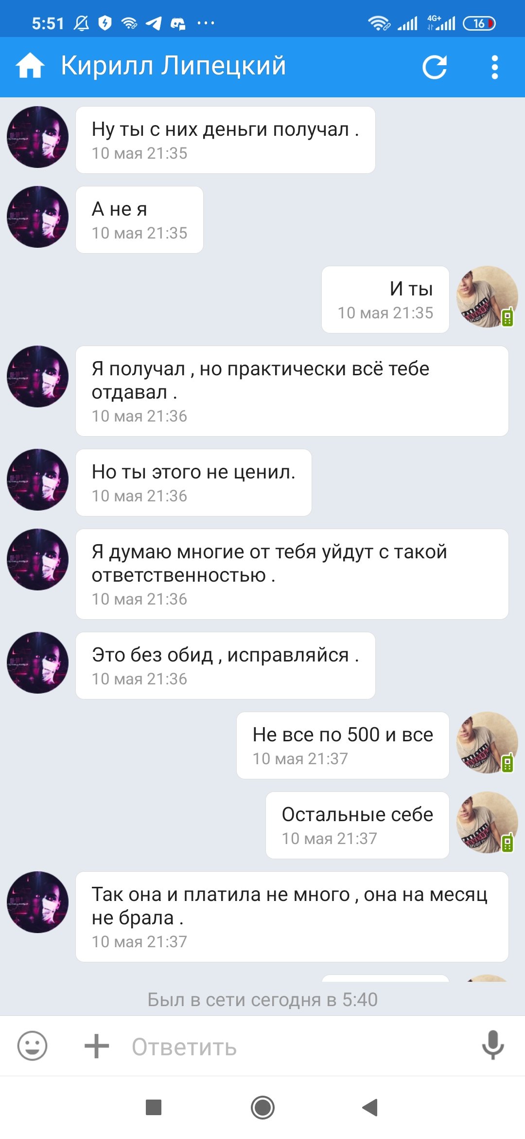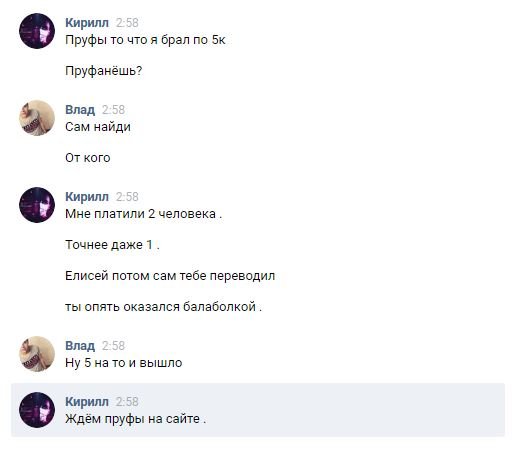 Guest Kirya Posted May 13, 2020 Posted May 13, 2020 2 minutes ago, Дмитрий Иваныч said: привет всем,я от Влада он мне крутит уже 2 месяца я его нашёл на его канале и попросил его мне крутить скидывал я ему по 700 в месяц это я сам так решил столько ему давать...поймите у человека не всегда есть время крутить вам,он мне тоже не всегда мог крутить но крутил...просто Кирил тебя чем то обидел вот ты и агришься...он мне рассказывал это была твоя инциатива приводить людей половину денег ты забирал себе... Регистрация 7 минут назад мне не о чём с тобой говорить , я готов скинуть всю переписку главному администратору . И предоставить аргументы людей " Своих клиентов " , что он не выполняет свою работу , говорит что он занят и не дома , а дни сгорают , а потом просит оплату сказав , что не хватает денег на сервер . Поэтому зря в тему написал , половину денег забирал себе за клиентов у нас с ним был договор помимо клиентов которых я привёл к нему те самые люди ' Клиенты ' приводили ему ещё людей которые так же не довольны им это будет урок для него на всю жизнь , за копейки 500-2500 рублей .