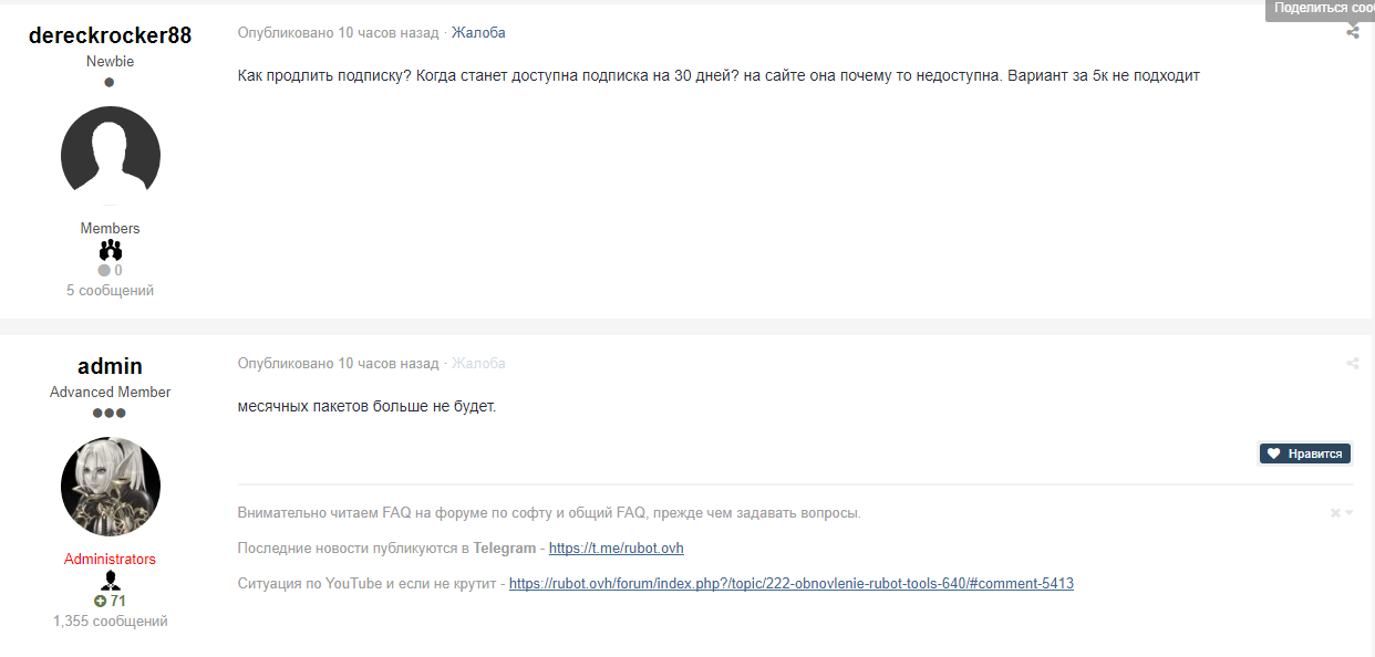 Guest dereckrocker88 Posted September 11, 2017 Posted September 11, 2017 Какой то бред а не форум, почему нельзя продолжить в той же теме? зачем закрывать сразу? не могу в той же теме оставить ответ или написать продолжение. В личку писать - не отвечают. как общаться то? хочу получить услуги от вас в итоге вообще желание отпадает что-то покупать. Можно конкретно либо в личке тогда пообщаться, либо тему не закрывать эту, чтобы выяснить что нужно! Вопрос в продолжение скрина (смотреть прикрепренку). - 6 месяцев за 5к, вы уж извините это слишком дорого и не нужно. Мне нужно держать онлайн разный, беру для себя. Онлайн вьюверов нужен 10-50 человек не больше. babatools freeware ни одна вообще не работает, ни одного вьювера не сделала. Что конкретно можете предложить? могу купить посоянную подписку на прогу вашу, но предложите адекватную цену тогда, для небольшого онлайна, готов и ежемесячную платить. Давайте в личке обсудим. ну серьезно. Почему не пойдете навстречу? если есть какие-то альтернативы готов обсудить. Надеюсь на понимание и дальнейшее обсуждение в личке.