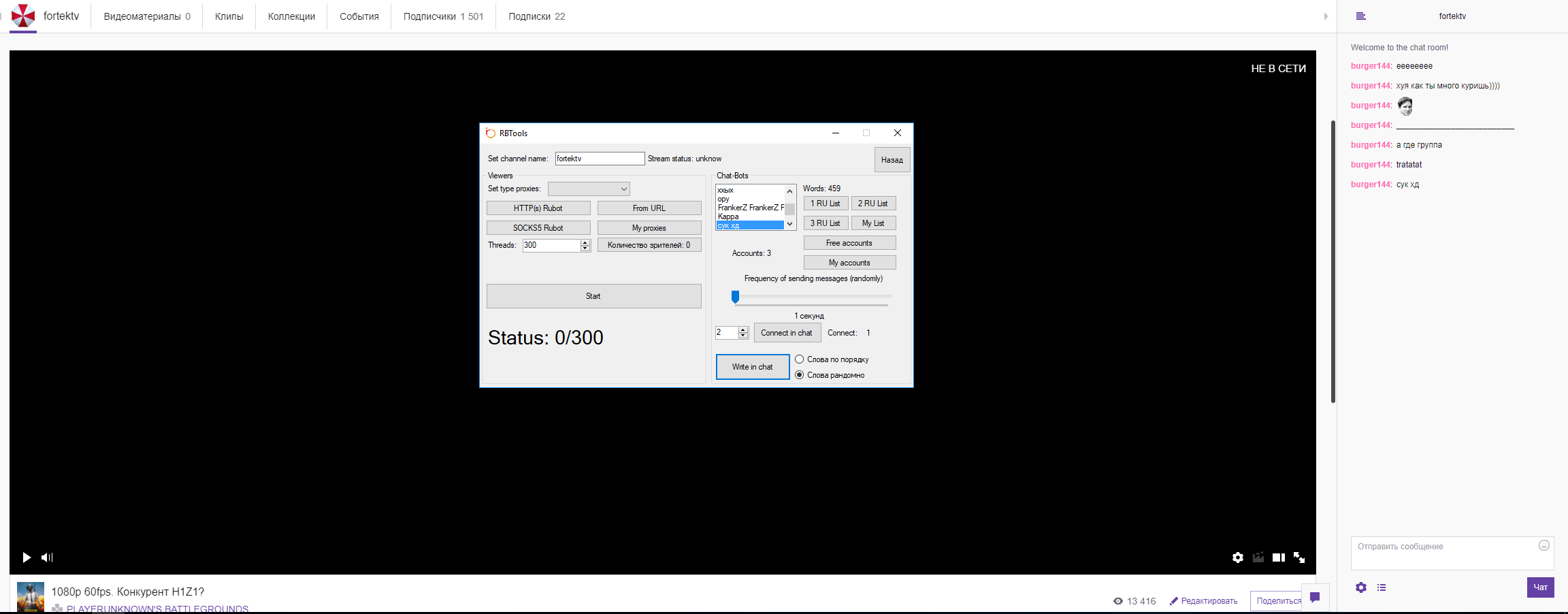 Admin Posted September 21, 2017 Posted September 21, 2017 56 минут назад, fageron сказал: Хочу загрузить своих чат ботов, но что-то не получается. Загружаю в таком виде: burg144:zh15wqy48xxbd3ggltvmkl2y2eu8gm burg144:oauth:zh15wqy48xxbd3ggltvmkl2y2eu8gm Что я делаю не правильно? Все делаю через notepad++ В чем проблема? Пишет он нормально, если нужно присоединить, то с этим проблем не возникает, делать надо в отдельном окне, если в первом идет накрутка лайв Проверил -все работает