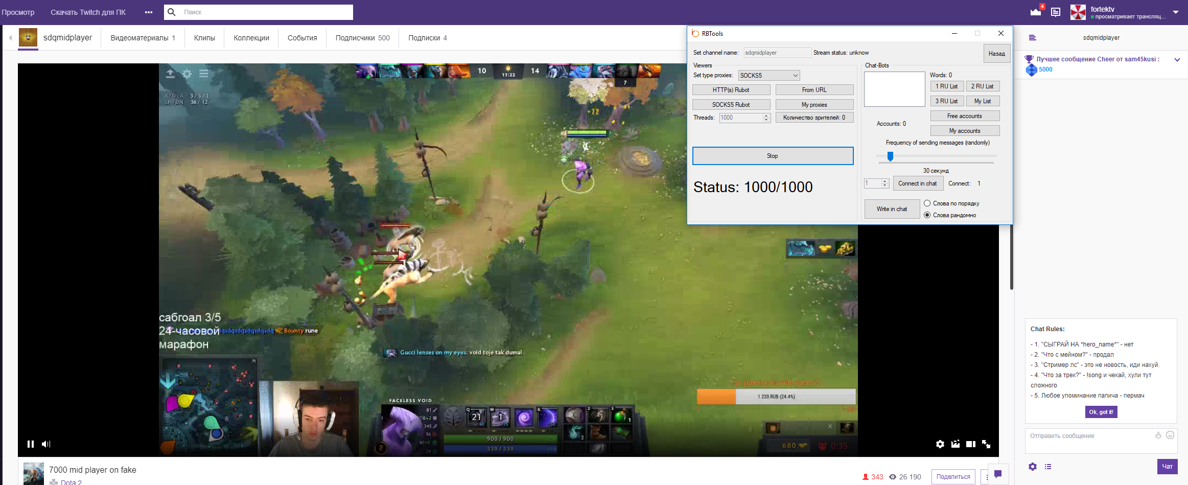 Admin Posted September 25, 2017 Posted September 25, 2017 4 часа назад, Aleksey2015 сказал: нисколько для чего дезинформировать? 4 часа назад, snd33905288 сказал: Всем привет! я очень давно покупал месяца 2 подрят накрутку когда ещё был самый первый софт! Потом на всё подзабил прошло около 4 месяцев Сколько в среднем сейчас крутит зрителей ? Спасибо! Свежий результат. Proxy.am тариф 5000 прокси 100 потоков. В софте - 1000 потоков. Твич: Под Ютуб пилим-пилим не допилим.
