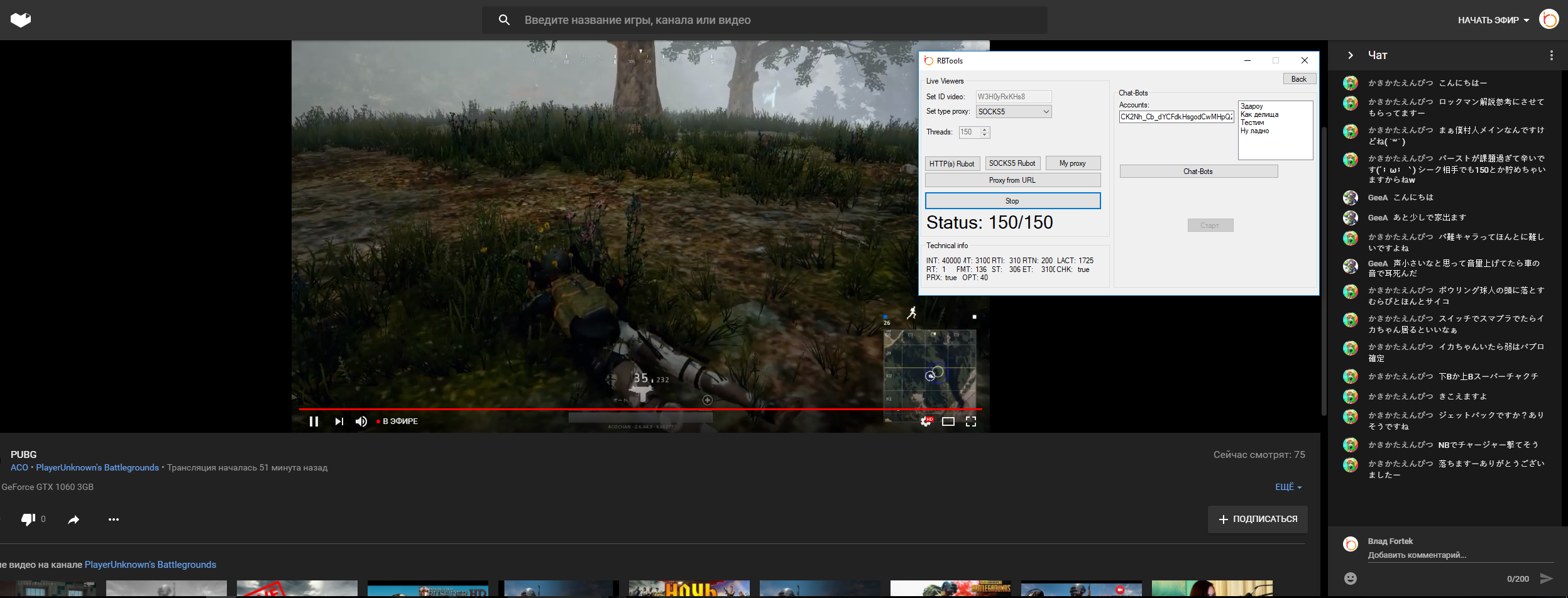 Admin Posted November 22, 2017 Posted November 22, 2017 32 минуты назад, Piro сказал: 1 поток работает с живой проксей. Прокси умирает - поток берет следующую живую проксю. По сути выставил 600 потоков - будет активно 600 проксей. И не факт того что будет 600 зрилов, так как есть внутренняя блокировка на Твиче. ---- Ну я понял что ты можешь 600 потоков запустить , а людей могут быть 100-200 , а если проверять допустим с прокси который якобы работает но не числится на твитвче оставлять допустим Коментарий , если получается оставляем если нет то убираем и менять на другой рабочий прокси , это же может привести к тому что ты используешь 600 потоков и будет 600 зрителей , либо это не так ? это так не работает. Чат-функционал вообще отделен от общей площадки и хостится на IRC-сервере Твича
