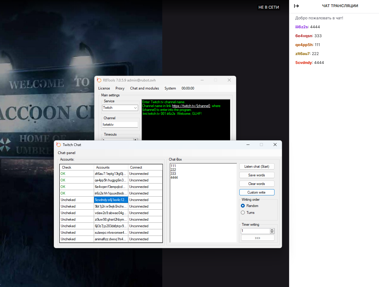 Admin Posted December 7, 2022 Posted December 7, 2022 22 hours ago, playup said: Купил аккаунты твич, они все подходят по логину и паролю если проверять в ручную - но в приложении пишется FAIL - как исправить И второй вопрос, по бесплатным подключаются все - но пишет только от одного пользователя landhhx (от других даже в ручном режиме не пишет) пофикшу в ближайшем обновлении, т.к проверка на валид происходила по другому методу. Бесплатные быстро улетают в бан, поэтому лучше покупать свой список https://rubot.ovh/topic/3275-magaziny-po-prodazhe-chat-botov-dlya-twitch/