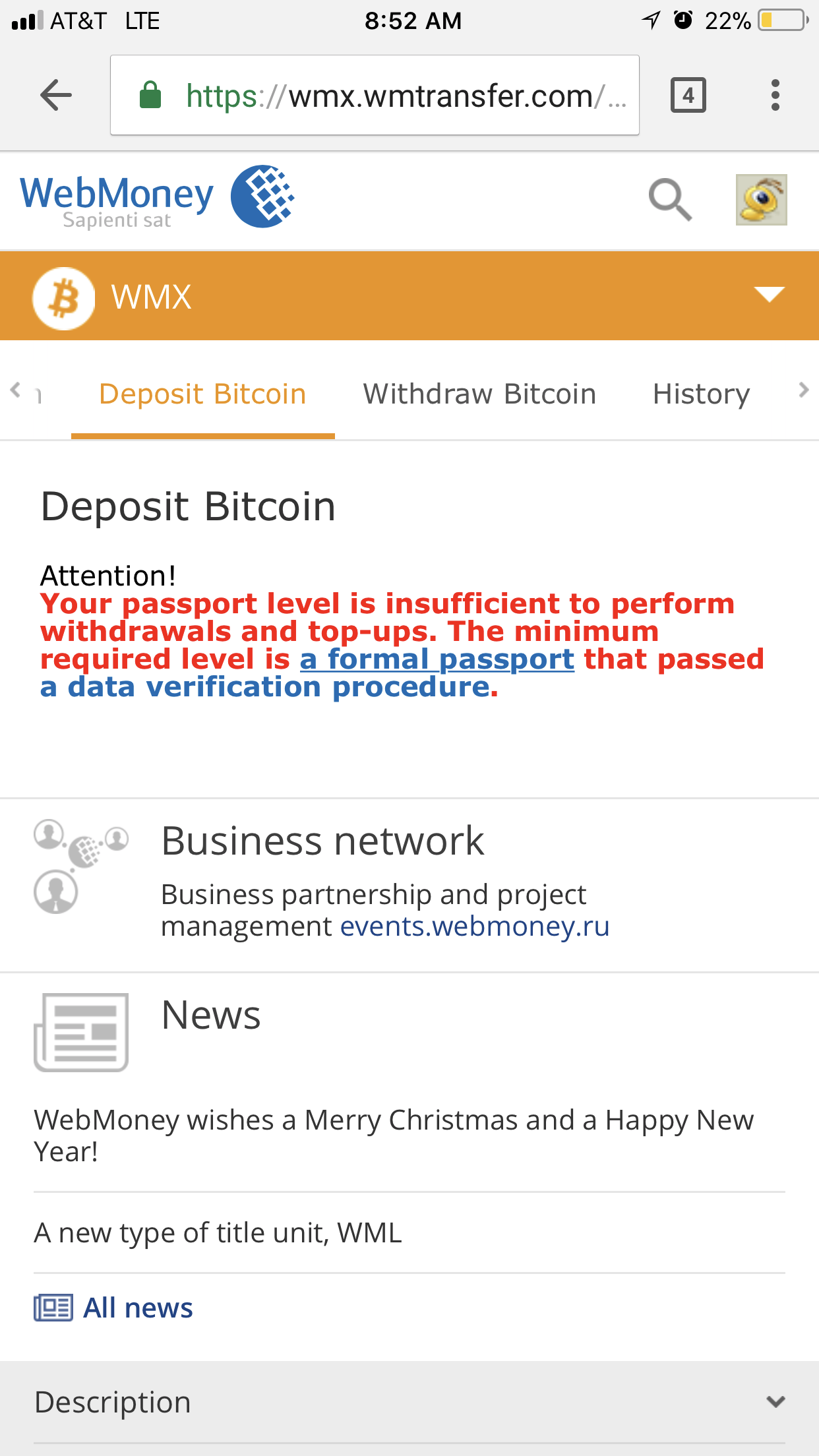 Guest alphacasters Posted January 24, 2018 Posted January 24, 2018 37 минут назад, SOA сказал: nope, just create an account and go to your wallets and create a BTC wallet then transfer btc to that webmoney wallet and you should be good on making payments through webmoney. I get this error when trying to top off or transfer funds. How old is your account? I made mine 2 days ago so it may be a new verification process. I guess I’ll photoshop a passport and hope they don’t do actual data record searching. If you’ve got any ideas let me know! Alpha