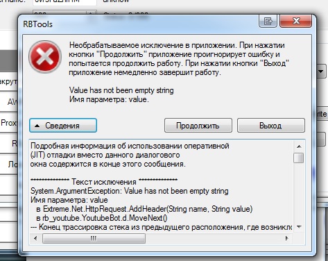 Guest alexseo Posted February 8, 2018 Posted February 8, 2018 При попытке поставить лайки сегодня выдаётся вот такая ошибка, аккаунты в формате Логин:пароль, с созданными каналами, не забаненные, я проверил, пару дней назад с них всё ставилось, а сегодня ошибка, что делать? Подробная информация об использовании оперативной (JIT) отладки вместо данного диалогового окна содержится в конце этого сообщения. ************** Текст исключения ************** System.ArgumentException: Value has not been empty string Имя параметра: value в Extreme.Net.HttpRequest.AddHeader(String name, String value) в rb_youtube.YoutubeBot.d.MoveNext() --- Конец трассировка стека из предыдущего расположения, где возникло исключение --- в System.Runtime.ExceptionServices.ExceptionDispatchInfo.Throw() ************** Загруженные сборки ************** mscorlib Версия сборки: 4.0.0.0 Версия Win32: 4.7.2558.0 built by: NET471REL1 CodeBase: file:///C:/Windows/Microsoft.NET/Framework64/v4.0.30319/mscorlib.dll ---------------------------------------- RuBotTools Версия сборки: 6.6.1.1 Версия Win32: 6.6.1.1 CodeBase: file:///C:/RubotTools/RuBotTools.exe ---------------------------------------- System Версия сборки: 4.0.0.0 Версия Win32: 4.7.2558.0 built by: NET471REL1 CodeBase: file:///C:/Windows/Microsoft.Net/assembly/GAC_MSIL/System/v4.0_4.0.0.0__b77a5c561934e089/System.dll ---------------------------------------- System.Windows.Forms Версия сборки: 4.0.0.0 Версия Win32: 4.7.2558.0 built by: NET471REL1 CodeBase: file:///C:/Windows/Microsoft.Net/assembly/GAC_MSIL/System.Windows.Forms/v4.0_4.0.0.0__b77a5c561934e089/System.Windows.Forms.dll ---------------------------------------- System.Drawing Версия сборки: 4.0.0.0 Версия Win32: 4.7.2558.0 built by: NET471REL1 CodeBase: file:///C:/Windows/Microsoft.Net/assembly/GAC_MSIL/System.Drawing/v4.0_4.0.0.0__b03f5f7f11d50a3a/System.Drawing.dll ---------------------------------------- System.Configuration Версия сборки: 4.0.0.0 Версия Win32: 4.7.2558.0 built by: NET471REL1 CodeBase: file:///C:/Windows/Microsoft.Net/assembly/GAC_MSIL/System.Configuration/v4.0_4.0.0.0__b03f5f7f11d50a3a/System.Configuration.dll ---------------------------------------- System.Core Версия сборки: 4.0.0.0 Версия Win32: 4.7.2558.0 built by: NET471REL1 CodeBase: file:///C:/Windows/Microsoft.Net/assembly/GAC_MSIL/System.Core/v4.0_4.0.0.0__b77a5c561934e089/System.Core.dll ---------------------------------------- System.Xml Версия сборки: 4.0.0.0 Версия Win32: 4.7.2558.0 built by: NET471REL1 CodeBase: file:///C:/Windows/Microsoft.Net/assembly/GAC_MSIL/System.Xml/v4.0_4.0.0.0__b77a5c561934e089/System.Xml.dll ---------------------------------------- rubotNet Версия сборки: 1.0.0.0 Версия Win32: 1.0.0.0 CodeBase: file:///C:/RubotTools/rubotNet.DLL ---------------------------------------- Microsoft.VisualBasic Версия сборки: 10.0.0.0 Версия Win32: 14.7.2558.0 built by: NET471REL1 CodeBase: file:///C:/Windows/Microsoft.Net/assembly/GAC_MSIL/Microsoft.VisualBasic/v4.0_10.0.0.0__b03f5f7f11d50a3a/Microsoft.VisualBasic.dll ---------------------------------------- eXtremeNet Версия сборки: 1.0.7.0 Версия Win32: 1.0.7.0 CodeBase: file:///C:/RubotTools/eXtremeNet.DLL ---------------------------------------- WindowsForm.Console Версия сборки: 1.9.30.1256 Версия Win32: 1.9.30.1256 CodeBase: file:///C:/RubotTools/WindowsForm.Console.DLL ---------------------------------------- System.Net.Http Версия сборки: 4.0.0.0 Версия Win32: 4.7.2558.0 built by: NET471REL1 CodeBase: file:///C:/Windows/Microsoft.Net/assembly/GAC_MSIL/System.Net.Http/v4.0_4.0.0.0__b03f5f7f11d50a3a/System.Net.Http.dll ---------------------------------------- mscorlib.resources Версия сборки: 4.0.0.0 Версия Win32: 4.6.1590.0 built by: NETFXREL2 CodeBase: file:///C:/Windows/Microsoft.Net/assembly/GAC_MSIL/mscorlib.resources/v4.0_4.0.0.0_ru_b77a5c561934e089/mscorlib.resources.dll ---------------------------------------- System.Windows.Forms.resources Версия сборки: 4.0.0.0 Версия Win32: 4.6.1590.0 built by: NETFXREL2 CodeBase: file:///C:/Windows/Microsoft.Net/assembly/GAC_MSIL/System.Windows.Forms.resources/v4.0_4.0.0.0_ru_b77a5c561934e089/System.Windows.Forms.resources.dll ---------------------------------------- ************** Оперативная отладка (JIT) ************** Для подключения оперативной (JIT) отладки файл .config данного приложения или компьютера (machine.config) должен иметь значение jitDebugging, установленное в секции system.windows.forms. Приложение также должно быть скомпилировано с включенной отладкой. Например: <configuration> <system.windows.forms jitDebugging="true" /> </configuration> При включенной отладке JIT любое необрабатываемое исключение пересылается отладчику JIT, зарегистрированному на данном компьютере, вместо того чтобы обрабатываться данным диалоговым окном.