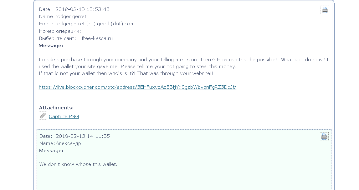 Admin Posted February 14, 2018 Posted February 14, 2018 1 час назад, rodgergerret сказал: Did you get a message back from them? У нас жаркая беседа идет с суппортом Free-Kassa. Они говорят что это не их кошелек. Мой ответ, цитирую: Цитата Смешно то, что вы даже ответить толком не можете ничего. Снимаете с себя всю ответственность: "не наш кошелек" и все. У вас при каждом новом заказе генерируются новые кошельки.Я понимаю что данной проблемой должен заниматься сам клиент, но т.к. он с Америки, ему сложно вести подобные диалоги.Его IP на момент заказа: 192.***.***.71, на момент оформления заказа в моем магазине было 10:23 по мск. С моего магазина заказ проходил под номером 6343, он же и проходит и у вас в биллинге как 30953347 на сумму 0.01053354 BTC в 10:29:14 MSK 13.02.2018.На скрине, который я прикладываю, в 10:30 по MSK оплата проведена успешна.В 10:34 пошли первые движения по транзакции: https://blockexplorer.com/tx/2d22617aa75c0314e5a31ddc2c6f000df11fcd5aa44b18af4d25530970e5f4c8и прошу разобраться с этим кошельком: 3EHFuxvzAzB3fjYxSgzbWbvqnFgRZ3DpJf на который шли средства.Предоставьте хоть какое-то опровержение тому что на заказ 30953347 был сгенерирован другой кошелек, который отличается от вышенаписанного, ну не поверю тому что вы подобный лог не ведете.