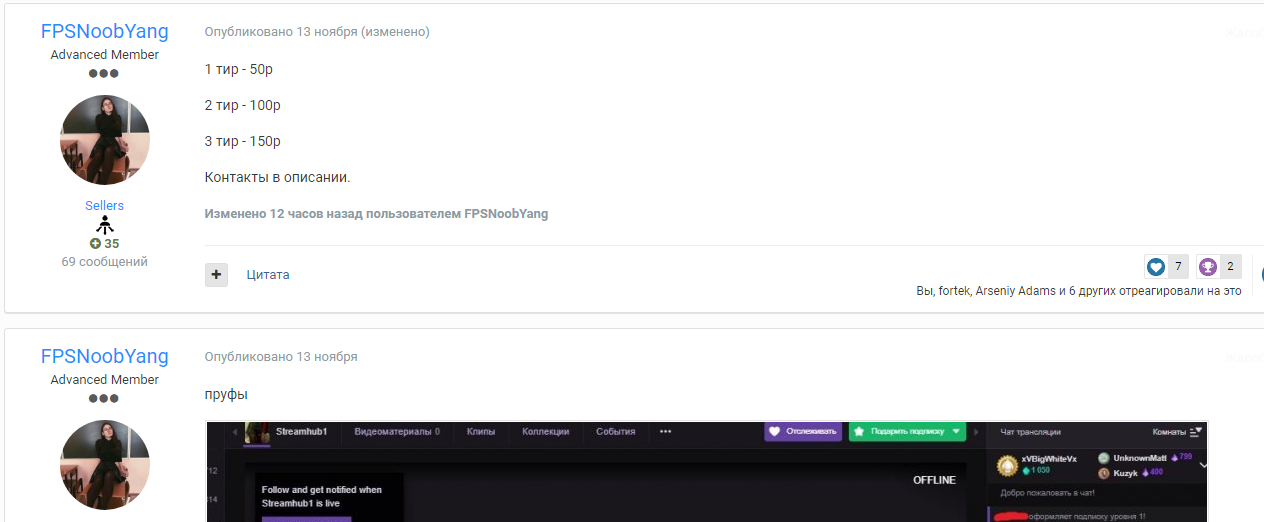 Guest Alex Urdya Posted December 24, 2018 Posted December 24, 2018 В 11/13/2018 в 11:15 AM, FPSNoobYang сказал: 1 тир - 50р 2 тир - 100р 3 тир - 150р Контакты в описании. В каком описание у тебя контакты? Не нашел, и в личку не отвечаешь ало ало прием