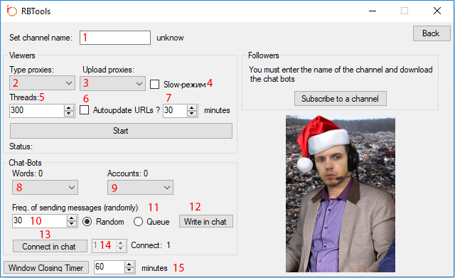 Admin Posted March 4, 2019 Posted March 4, 2019 AHTUNG! Twitch.tv очень требователен к качеству проксей. Дешевая накрутка на овермиллион зрителей отсутствует уже больше года. Ищите качественные прокси и не поштучно. Перед вами показан Twitch-раздел. Разберем по пунктам. 1. Здесь вводим название канала. Пример, https://twitch.tv/arthas. Вам надо ввести только название, которое идет после https://twitch.tv/, исходя из нашего примера, arthas. 2. Здесь выбираем тип прокси (HTTP(s) и SOCKS5). Рекомендуем использовать SOCKS5 прокси. Обратите внимание что при методе HTTP(s) и загруженных SOCKS5 проксях (пункт 3) накрутка происходит не может. Тип прокси должен совпадать с загружаемыми прокси. 3. Загружаем прокси. Доступно: RuBot proxies - доступно в том случае, если вы приобрели прокси по этой ссылке на нашем сайте. Прокси должны быть привязаны к аккаунту, на который приобретена программа RBTools. My Proxies - можно загрузить прокси из текстового файла (*txt-формат). From URL - перед вами откроется форма, где можно ввести URL-адреса для импорта проксей по ссылкам. Каждая ссылка должна быть в новой строчке. 4. Slow-режим - активация этого параметра, сокращается нагрузку на интернет-канал и на цп, что в дальнейшем скажется на накрутку в меньшую сторону. Используется в основном для меньшего разброса по зрителям. По умолчанию установлен хард-режим, который выдает максимальное количество зрителей по отношению к потокам. Результативный тест исходя из 600 потоков: Hard-режим (стандартный) - 4600+ активный соединений. Каждый поток в программе работает по всему загруженному списку проксей. Итог: задействуется весь список прокси одновременно Slow-режим - 580 активных соединений. Каждый поток в программе работает с 1 случайной прокси из загруженного списка. Если прокси "умирает" - поток ищет живую прокси. Итог: Задействуется количество проксей = количество потоков. Хотим обратить внимание, что на Твиче активно борятся с накруткой в любом ее проявлении и алгоритмы Твича имеют свой "черный" список проксей. По сути, через прокси можно посещать Твич и смотреть трансляции, но как зритель вы не будете отображаться. Поэтому не думайте что 1000 проксей дадут вам результат 1000 зрителей, разве что максимум 200-300 зрителей. Потому рекомендуем использовать большой пул прокси. 5. Threads(потоки) - программные потоки. Чем больше потоков - тем больше нагрузка на ЦП и интернет-канал. Если ваш провайдер дает вам 200 мбит интернет, это не означает что он супер хороший. У вас не должно быть ограничений на TCP-соединения. Если при накрутке ваш интернет начинает дико лагать и отключаться, можете спокойно менять провайдера, вам блокируют множественные соединения. Мы же работает с проксями - не забываем, а значит эмулируем зрителей. Для таких целей был сделан Slow-режим. Для максимального профита используйте VPS(VDS)-сервера, т.к. подобные вещи располагаются на магистральных каналах и не имеют ограничений. Админ рекомендует 500 потоков на 1 окно - золотая середина. 6. Autoupdate URL - прокси имеют свойство "умирать", они не резиновые и используете их не только вы. Потому они имеют свойство "отваливаться". Качественные прокси-сервисы поддерживают список "живых" прокси, потому загружая каждый раз по URL прокси - вы будете иметь самые актуальные прокси на данный момент. В программе RBTools ставя галочку на автообновление прокси и поставив таймер(7), программа будет автоматически переподгружать прокси через определенный промежу